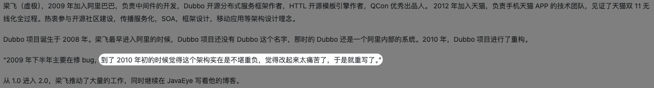 如果你去深度的追寻Dubbo的起源,你一定会感受到的一点:Dubbo不是一项KPI工程。我们熟知的Dubbo2.x是由一群热爱代码的专家为了解决1.x的问题来自行孵化、设计的,不是交作业、不是蹭热点。